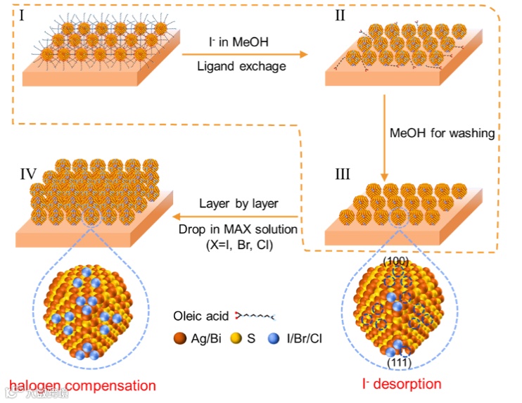 图1. 采用固态配体交换及后处理钝化的AgBiS2量子点薄膜沉积过程示意图(棕色、黄色和蓝色小球分别代表银 / 铋、硫和卤化物原子)。