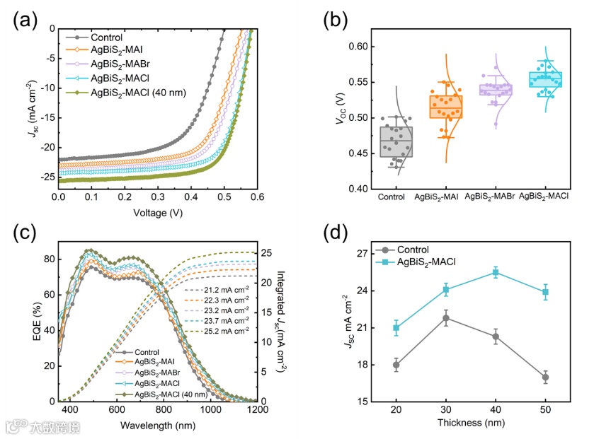 图3. 基于AgBiS2胶体量子点的太阳能电池的光伏性能:a)在一个太阳光照强度下,采用对照样及AgBiS2-MAX胶体量子点的太阳能电池的电流-电压(J-V)特性曲线。b)从每组20个器件中提取出的对照样及AgBiS2-MAX器件的开路电压统计数据。c)采用对照样品以及AgBiS2-MAX胶体量子点的太阳能电池的外量子效率(EQE)曲线以及积分短路电流密度。d)对照样及AgBiS2-MAX器件在不同活性层厚度下的短路电流密度。