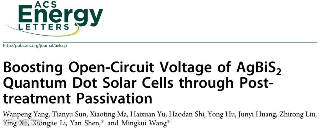 华中科技大学的王鸣魁教授与申燕教授在国际知名期刊ACS Energy Letters上发表题为“Boosting Open-Circuit Voltage of AgBiS2 Quantum Dot Solar Cells through Post-treatment Passivation”的文章。提出了一种简便的量子点表面钝化技术,即先用碘化物对AgBiS2胶体量子点进行表面配体交换,再采用卤化物进行后处理制备AgBiS2量子点薄膜。这种后处理钝化AgBiS2胶体量子点的技术,不仅能有效抑制质子溶剂侵蚀而造成的表面配体损失,而且能显著降低表面缺陷态密度。在使用氯离子后处理钝化AgBiS2量子点太阳能电池光电转换效率达到10.02%,其开路电压(VOC)显著提高至0.581V,这是目前AgBiS2量子点太阳能电池报道的最高输出电压。