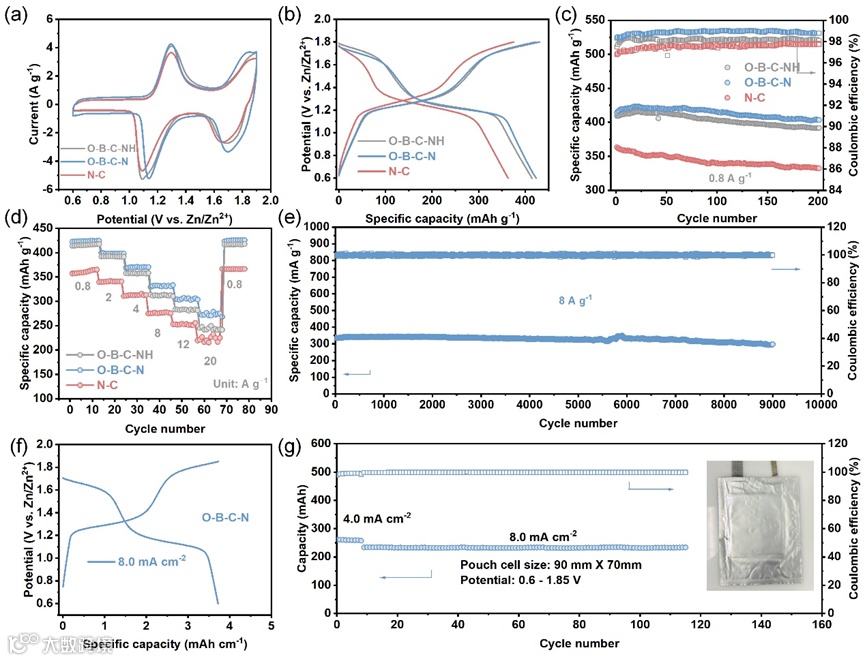图4. (a) 在1 mV s−1扫描速率下,Zn-I2电池使用N-C、O-B-C-N和O-B-C-NH催化剂的CV曲线。(b) 在0.8 A g−1电流密度下,Zn-I2电池的恒流充放电曲线。(c) 使用N-C、O-B-C-N和O-B-C-NH正极的Zn-I2电池的循环稳定性和库仑效率(CE)。(d) 使用不同催化剂的Zn-I2电池的倍率性能。(e) 在8 A g−1电流密度下,使用O-B-C-N催化剂的Zn-I2电池的循环稳定性。(f) Zn-I2电池使用O-B-C-N催化剂的恒流充放电曲线。 (g) 使用O-B-C-N催化剂的Zn-I2电池的循环稳定性。