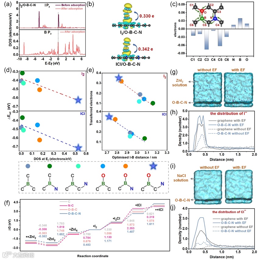 图2. O-B-C-N与I2/ICl物种相互作用的计算:(a) I2吸附后O-B-C-N中I2和B的态密度(DOS);(b)差分电荷分布图;(c) I2吸附后O-B-C-N中不同原子的电子变化;(d) I2和ICl的吸附能与费米能级上B位点的DOS关系;(e)吸附I2/ICl过程中转移的电子数与最优B-I距离的关系;(f)不同域上碳宿主上I−/I+转化的吉布斯自由能变化。(g, h) 在纯石墨烯或含有O-B-C-N的碳框架上,在有或没有外加电场的条件下,I−和(i, j) Cl−在水溶液中的分布。