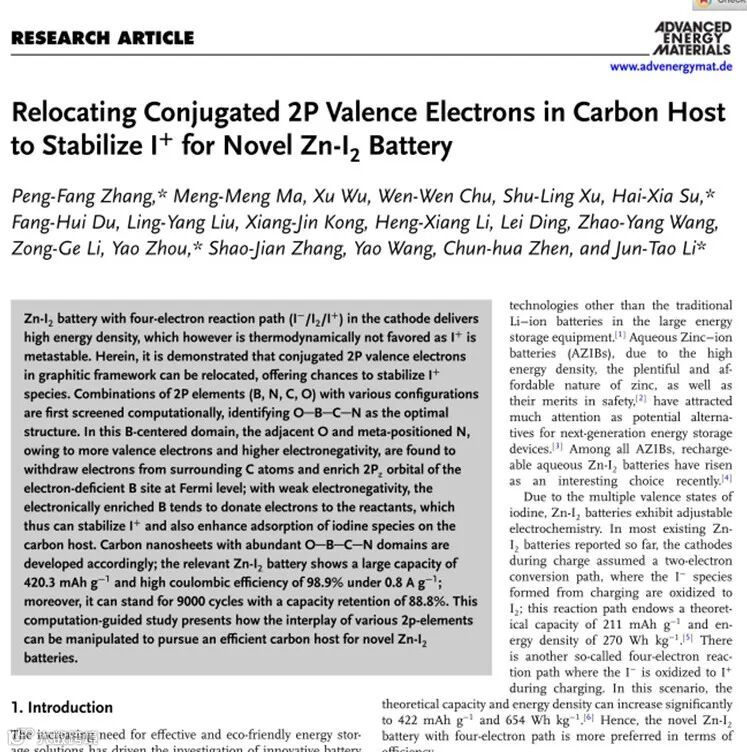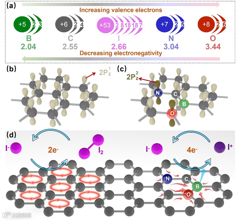 该论文着重归纳总结了聊大张鹏方、厦大周尧和李君涛团队通过调控共轭2P价电子以稳定新型Zn-I2电池中的I+。这一研究从不同元素的电负性出发,利用碘的高电负性从低电负性硼位点抽取电子,同时,硼周围氮和氧可作为“电子泵”,从周围的C原子中吸引电子,转而流向B位点,并通过B位点流向碘(周围碳Cà O-B-C-N 中O, N, C à B 位点 àI吸附物种),从而稳定I+,加快四电子碘转化速率,该工作发表在期刊Advanced Energy Materials上。