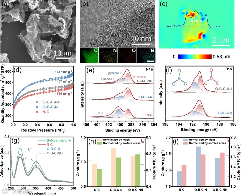 图3. (a) O-B-C-N催化剂的SEM图像,(b) HRTEM图像以及C、N、O和B元素的EDS分布图。(c) O-B-C-N纳米片的激光扫描共聚焦显微镜图像(插图为高度变化)。(d) N-C、O-B-C-N和O-B-C-NH催化剂的N2吸附和脱附等温线。(e) N-C、O-B-C-N和O-B-C-NH催化剂的N1s XPS光谱。(f) O-B-C-N和O-B-C-NH催化剂的B1s XPS光谱。(g)在N-C、O-B-C-N和O-B-C-NH催化剂吸附前后I3−带的UV-Vis光谱变化强度。(h) N-C、O-B-C-N和O-B-C-NH催化剂的I3−吸附量和(i) I2吸附量,均以质量和比表面积归一化。