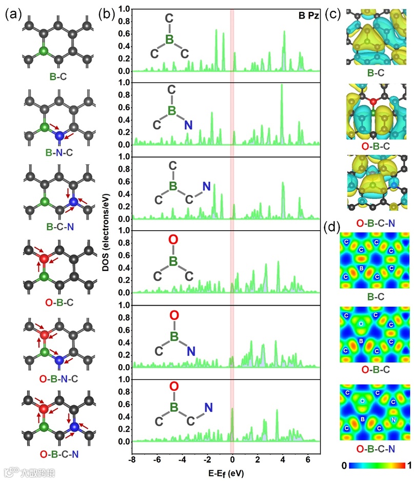 图1. (a) 本研究中探讨的B中心域的优化结构(红色箭头表示电子转移)。(b)不同域中B原子的态密度(DOS)。(c) B-C、O-B-C和O-B-C-N的混合轨道图,其中显示的是费米能级上的轨道。(d) 它们的电子局域函数(ELF),其中红色和蓝色分别表示电子富集区和电子缺乏区。