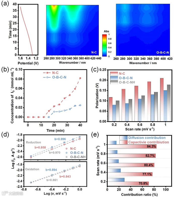 图5. (a) Zn-I2电池的恒流充电曲线和原位UV-vis光谱。(b) 电解液中I3−浓度的变化。(c) Zn-I2电池的极化电位与扫描速率的关系,涉及I2/I+转化。(d) I2/I+转化过程中,log(ip)与log(v)之间的相关性。(e) 使用O-B-C-N催化剂的Zn-I2电池中,电容性和扩散性贡献的比例。