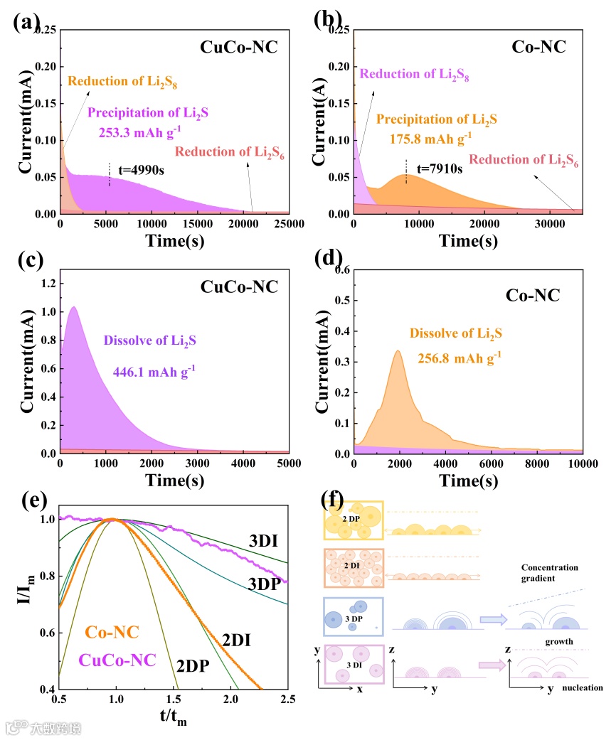 Fig. 5. Li2S deposition profile of (a) CuCo-NC and (b) Co-NC, Li2S dissolution profile of (c) CuCo-NC and (d) Co-NC, (e) growth model of Li2S and (f) schematic diagrams of nucleation and growth of four Li2S.