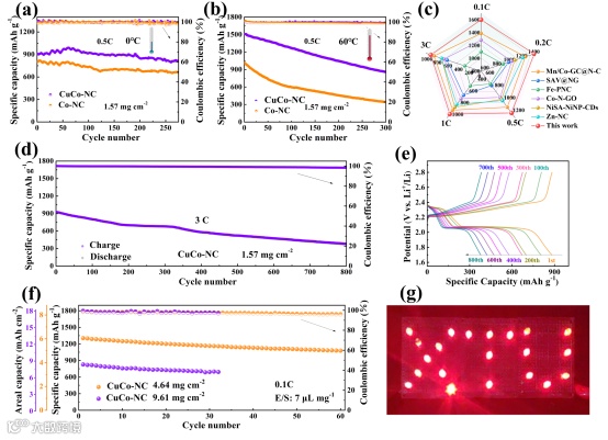 Fig. 6. Cycling performance plots at (a) 0°C and (b) 60°C, (c) radar chart of rate capability, (d) long-cycle performance graph at 3 C and (e) corresponding GCD curves. (f) High sulfur loading performance map of cells with CuCo-NC. (g) Digital photographs of LEDs lighted by CuCo-NC-based cell.