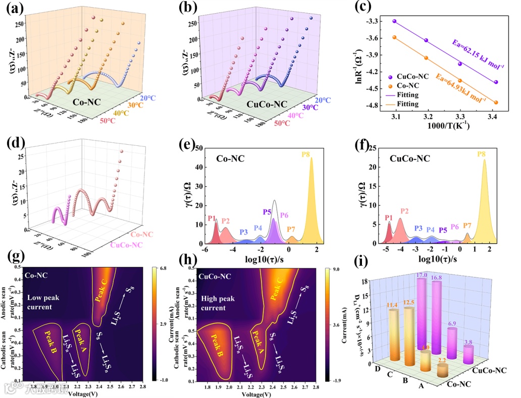 Fig. 4. EIS curves of (a) Co-NC and (b) CuCo-NC at different temperatures, (c) corresponding activation energy, (d) comparison of EIS curves before and after cycling, DRT plots corresponding to impedance data of (e) Co-NC and (f) CuCo-NC, CV Contour of (g) Co-NC and (h) CuCo-NC, (i) 3D histogram of lithium-ion diffusion coefficient.