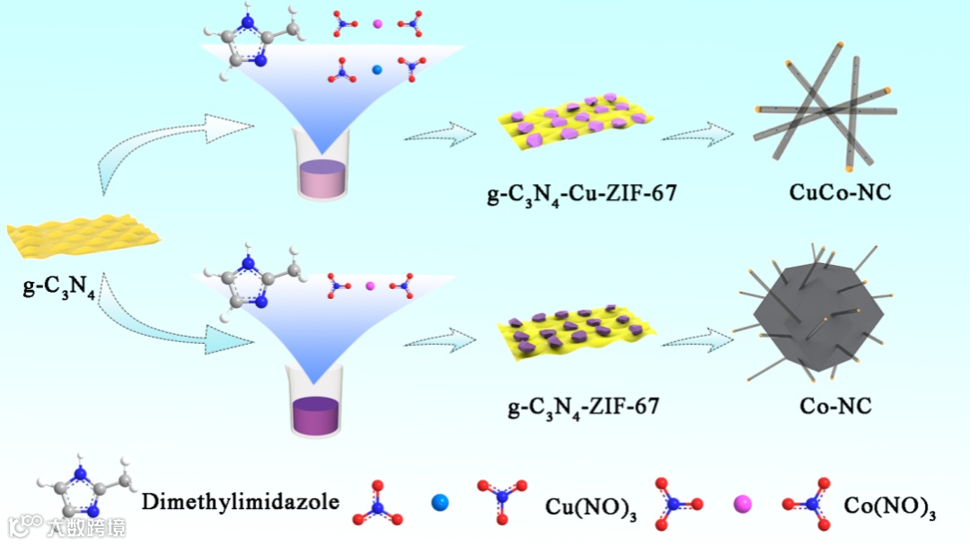 图1展示了CuCo-NC材料的合成过程。g-C3N4在做为氮源的同时,也做为模板用于吸附Co2+和Cu2+,经过水热处理,原位生长形成前驱体Co/Cu-ZIF。再经热处理得不同形貌氮掺杂碳纳米材料。为了探究CuCo-NC中碳纳米管生长机制,通过控制管式炉的烧结温度得到了不同温度下合成的CuCo-NC材料。随着温度升高,ZIF的多面体骨架逐渐消失,而一维纳米管持续生长。这是因为高温导致碳氮材料内部的原子重排更加剧烈。较高的烧结温度不仅促进了碳源的分解,还优化了材料的表面结构,从而有利于一维碳纳米管的原位生长。