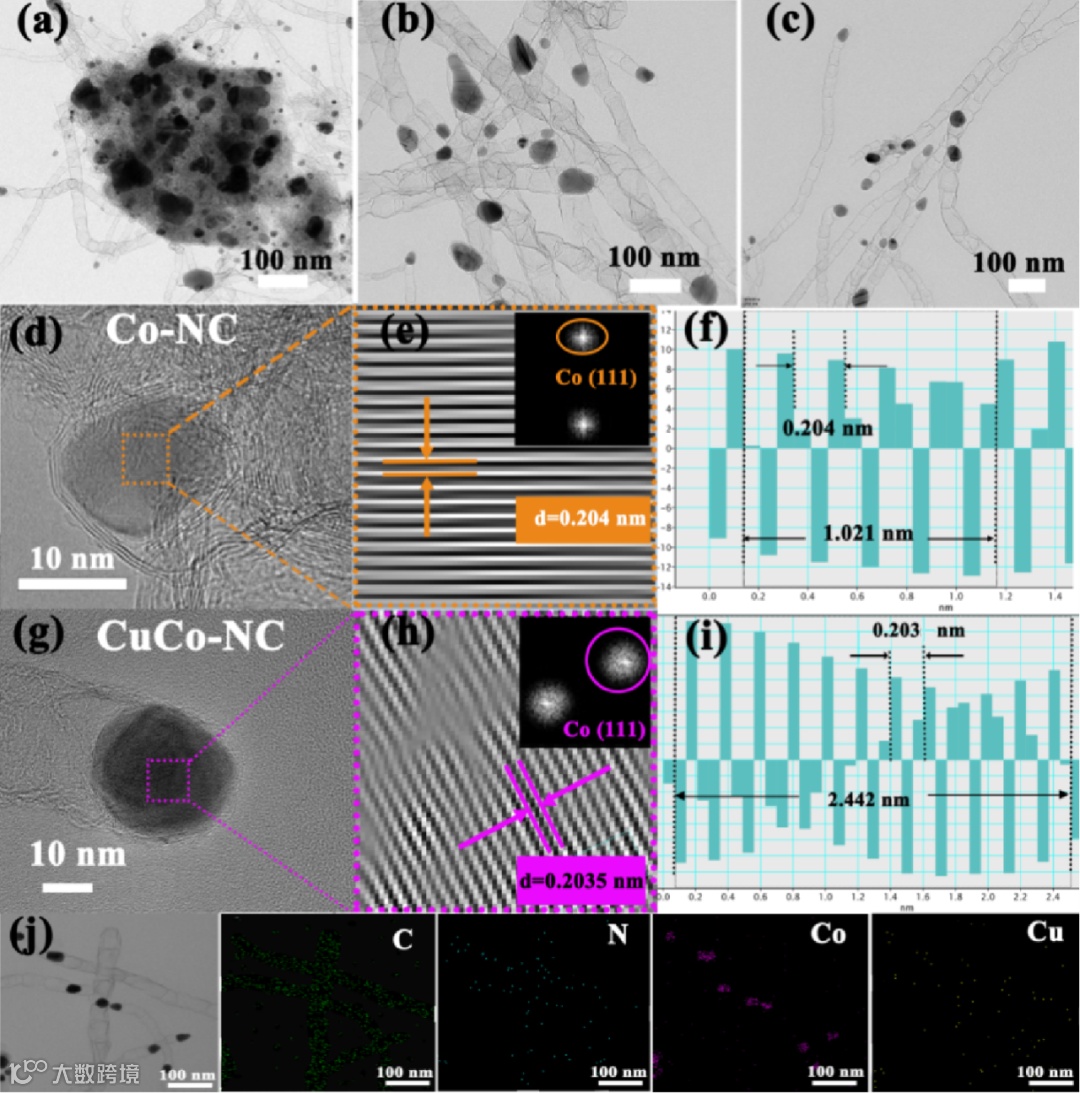 Fig. 2. TEM images of (a) Co-NC and (b,c) CuCo-NC, along with HRTEM images of (d) Co-NC and (g) CuCo-NC, inverse FFT lattice images of (e) Co-NC and (h) CuCo-NC, (f,i) correspondence analysis of lattice spacing, and (j) elements mapping of CuCo-NC.