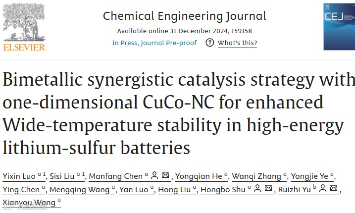 Luo Y, Liu S, Chen M, et al. Bimetallic synergistic catalysis strategy with one-dimensional CuCo-NC for enhanced Wide-temperature stability in high-energy lithium-sulfur batteries[J]. Chemical Engineering Journal, 2024: 159158.