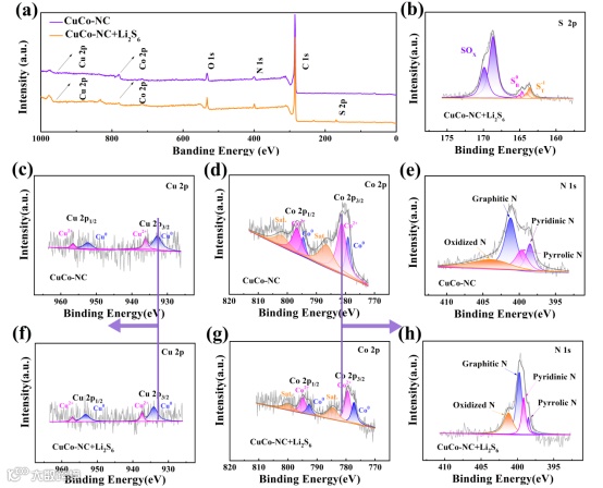图3中,通过对XPS谱图的分析,在CuCo-NC中检测到主要元素为Cu、Co、N和C。在吸附Li2S6后出现S特征峰,是由于CuCo-NC与LiPSs的氧化还原反应生成SOx。Cu和Co以不同价态(Cu0、Cu2+、Co0、Co2+)存在,影响其电子结构和催化活性。Cu0和Co0提升导电性,促进LiPSs还原;Cu2+和Co2+有助于稳定LiPSs,减缓穿梭效应,提升电池性能。吸附后,Co 2p和Cu 2p对应的峰的结合能分别发生了蓝移和红移,表明CuCo-NC与LiPSs之间存在强相互作用,可促进电子转移。双金属的协同效应增强了对LiPSs吸附作用且促进了电荷传输,从而有效提升了催化性能。