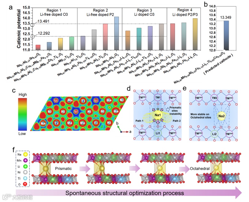 图1.低Na的O3类材料成相的阳离子势区间及Na+在局部较大离子势能差驱动下的八面体占位偏好。