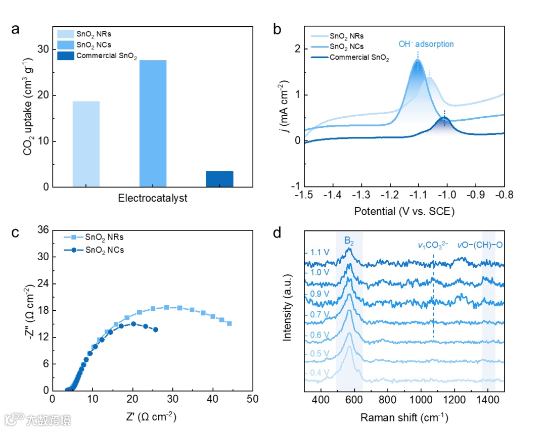 图4. a) 相对压力P/P0 = 1时的CO2吸收量; b) N2饱和的0.1 M KOH中的氧化LSV曲线; c) 在CO2饱和的0.5 MKHCO3电解液中,-0.6 V vs RHE下的Nyquist图; d) 在0.1 M KHCO3电解液中SnO2 NCs的原位拉曼光谱测试。