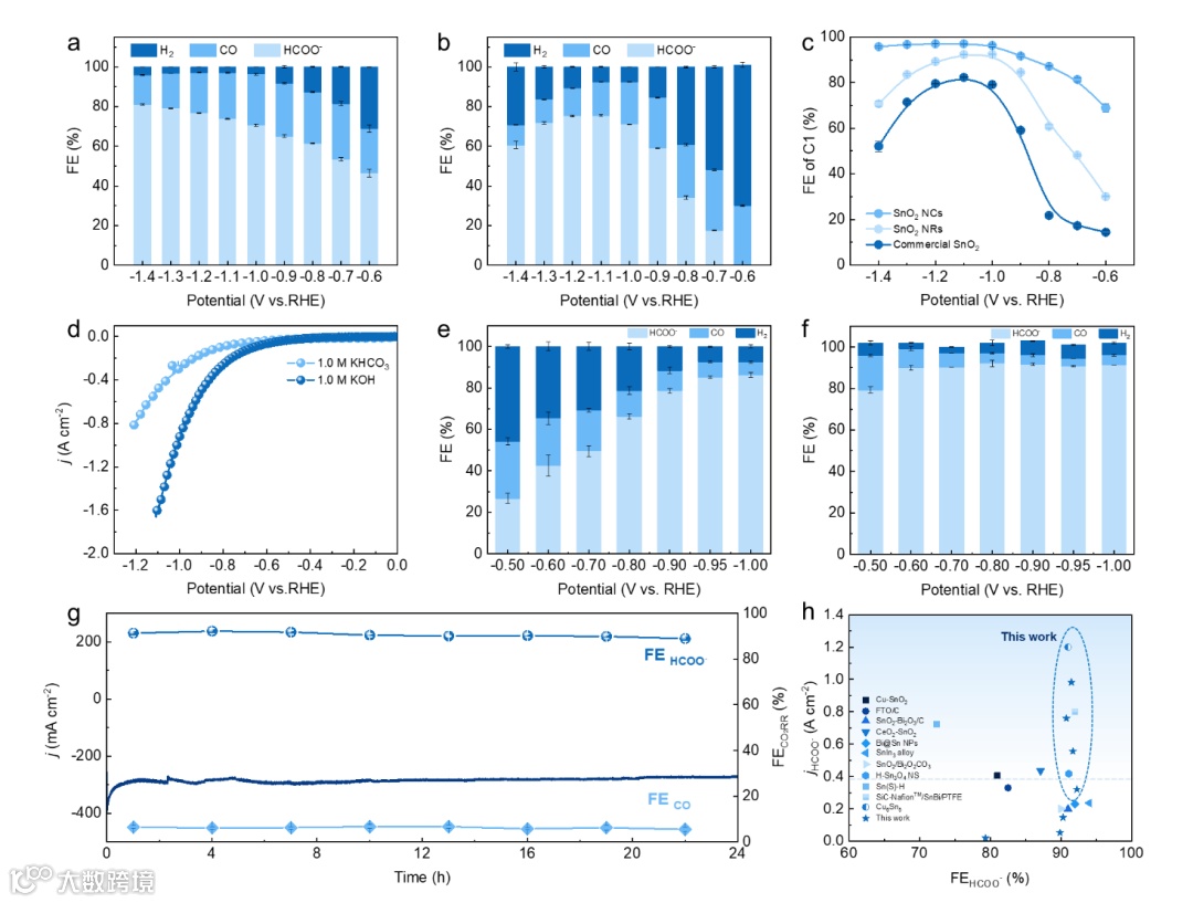 图3. a) SnO2 NCs和b) SnO2 NRs在CO2饱和的0.5 M KHCO3的H池中的产物FEs; c) 不同电势下碳产物的FEs; d) 在1.0 M KHCO3和1.0 M KOH电解液的流动池中SnO2 NCs的LSV曲线比较; e) SnO2 NCs在1.0 M KHCO3电解液中的FEs; f) SnO2 NCs在1.0 M KOH电解液中的FEs; g) SnO2 NCs在1.0 M KOH电解液的流动池中,在-0.8 V vs RHE下的稳定性测试; h) 此研究与最近报道的锡基电催化剂在流动池中甲酸盐FE和jHCOO-的比较。