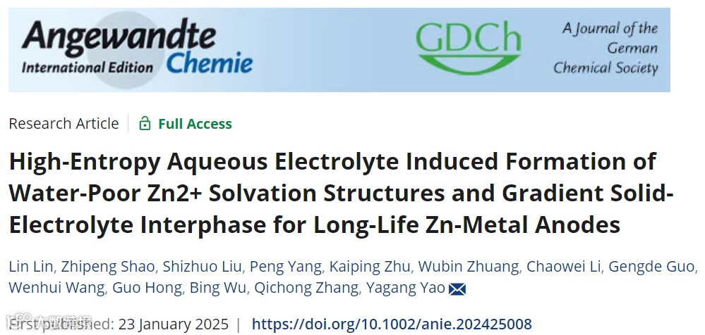 近日,来自南京大学的姚亚刚教授与中科院苏州纳米所的张其冲研究员合作,在国际知名期刊Angewandte Chemie International Edition上发表题为“High-Entropy Aqueous Electrolyte Induced Formation of Water-Poor Zn2++ Solvation Structures and Gradient Solid-Electrolyte Interphase for Long-Life Zn-Metal Anodes”的研究型文章。该工作报道了一种新型的高熵电解质,由等摩尔的Zn(OTf)₂和LiOTf与等体积的水、磷酸三乙酯(TEP)和二甲基亚砜(DMSO)组成,通过增加溶剂化熵显著提高了电解质的稳定性。这种精心设计的高熵电解质减少了溶剂化和自由水分子的含量,同时在锌负极表面形成了稳固的梯度固体电解质界面(SEI)层,有效抑制了水分子对锌负极的腐蚀。此外,锌负极表面的阳离子静电屏蔽层有效抑制了“尖端效应”,实现了锌的均匀沉积。因此,采用这种高熵电解质组装的Zn//Zn对称电池在1 mA cm-2和0.5 mAh cm-2的条件下能够稳定运行超过8000小时。组装的Zn//V₂O₅·H₂O软包电池在1 A g-1的条件下循环420次后仍能保持83.1%的初始容量。该工作通过利用不同组分的显著协同效应,实现了更高的无序性和复杂性,为优化锌/电解质界面和提高锌金属负极的稳定性提供了重要参考。
