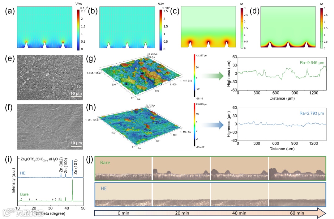 图3. (a) 原始电解质和(b) HE电解质180 s后的电场分布模拟。(c) 原始电解质和(d) HE电解质180 s后的Zn2+浓度场分布模拟。(e) 原始电解质和(f) HE电解质中锌负极循环30次后的SEM图像。(g) 原始电解质和(h) HE电解质中锌负极循环30次后的三维共聚焦激光扫描显微镜图像和相应的表面粗糙度曲线。(i) 锌负极循环30次后的XRD图谱。(j) 原始电解质和HE电解质中锌沉积过程的原位光学显微镜图像。