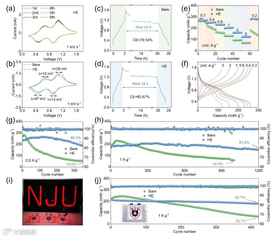 图6. (a) HE电解质在1 mV s-1扫描速率下的前六个CV循环曲线。(b) 原始电解质和HE电解质的CV曲线。使用(c) 原始电解质和(d) HE电解质进行自放电分析。(e) 原始电解质和HE电解质中Zn//V2O5·H2O全电池的倍率性能。(f) HE电解质中不同电流密度下的GCD曲线。在(g) 0.2 A g-1和(h) 1 A g-1条件下,原始电解质和HE电解质中Zn//V2O5·H2O全电池的循环稳定性。(i) 使用HE电解质的三个Zn//V2O5·H2O软包电池串联为LED充电的演示。(j) 在1A g-1下,原始电解质和HE电解质中Zn//V2O5·H2O软包电池的循环稳定性。