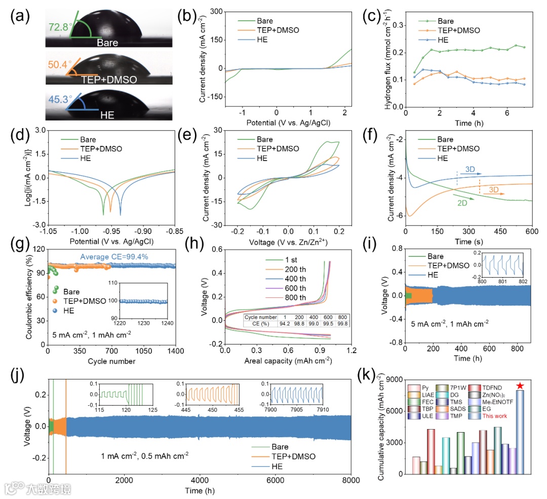 图4. (a) 不同电解质的接触角。(b) LSV曲线。(c)析氢速率曲线。(d) Tafel曲线。(e) CV曲线。(f) CA曲线。(g) 不同电解质中Zn//Cu非对称电池的CE曲线。(h) HE电解质中Zn//Cu非对称电池的电压-容量曲线。不同电解质中Zn//Zn对称电池在(i) 5 mA cm-2, 1 mAh cm-2和(j) 1 mA cm-2, 0.5 mAh cm-2下的恒流循环。(k) 性能雷达图。