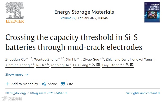 近日,来自清华大学的康飞宇教授和彭乐乐副教授,在国际知名期刊Energy Storage Materials上发表题为“Crossing the capacity threshold in Si-S batteries through mud-crack electrodes”的文章。本文首次提出了硅硫(Si-S)电池体系中的容量阈值概念,揭示了硅负极动力学在全电池容量发挥中的关键作用。在此基础上,研究进一步引入了一种具有高锂离子扩散能力的“泥裂”结构负极,成功突破了硅硫电池体系的容量阈值,并组装了高载量的硅硫全电池。