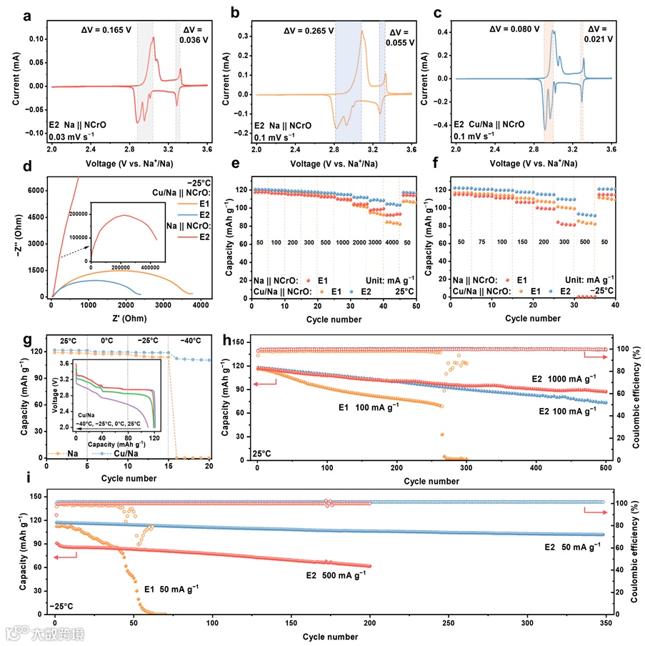 匹配正极材料组装电池,在常温和低温下,Cu/Na||NaCrO2电池搭配设计的E2电解液都实现了极化的降低,获得了优异的倍率性能以及稳定的循环。