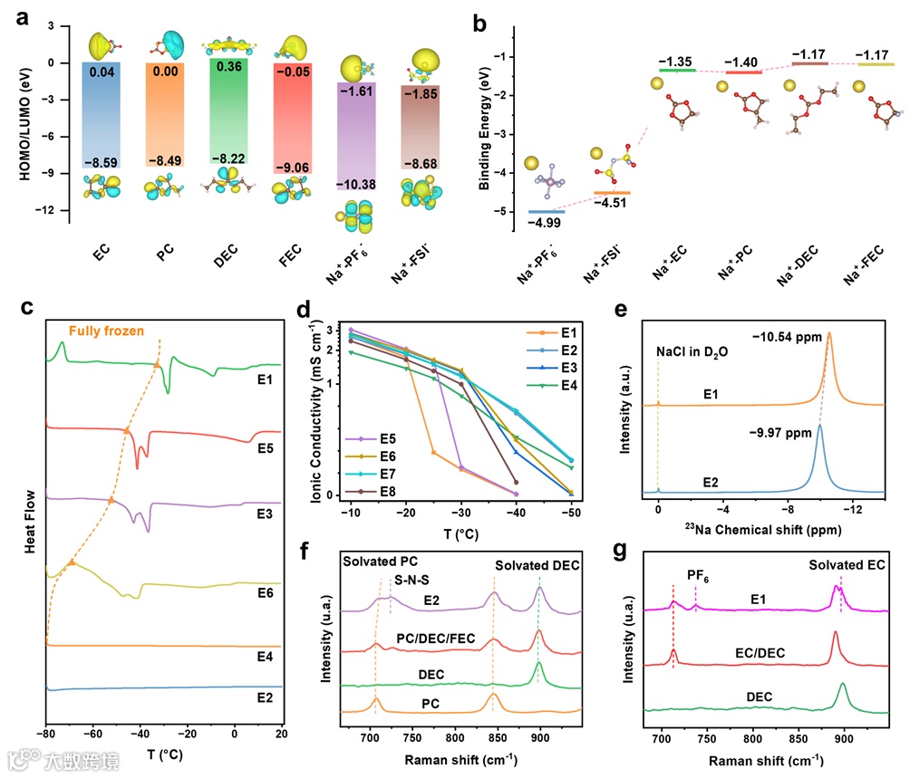 首先对电解液进行筛选。在低温电解液设计中需要避免使用高冰点的碳酸乙烯酯(EC,36.4°C),同为环状结构的碳酸丙烯酯(PC,−48.8°C)使一个更好的选择。同时,增加体系中的碳酸二乙酯(DEC)组分,由于其低的冰点(−74.3°C)和与Na+之间弱的相互作用,可以拓宽电解液液程并减小界面脱溶剂化能。氟代碳酸乙烯酯(FEC)则用于优先在负极成膜以提升负极/电解液界面稳定性。