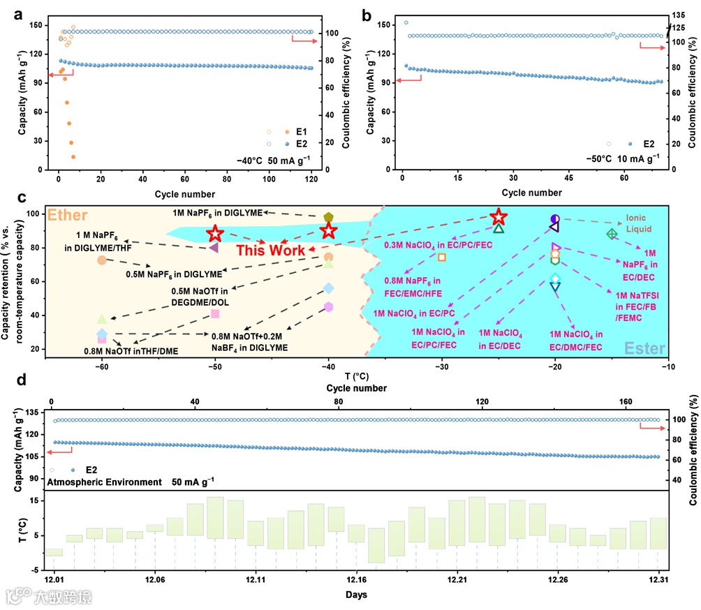 在−40°C和−50°C的极低温度下,钠金属电池依旧能实现稳定工作,并保持了高的比容量。即使是在温度不断变化的大气环境中,电池依旧能稳定工作一个月。本工作拓宽了碳酸酯基电解液的使用范围,为提升碳酸酯基钠金属电池在低温下的电化学性能提供了一种新策略