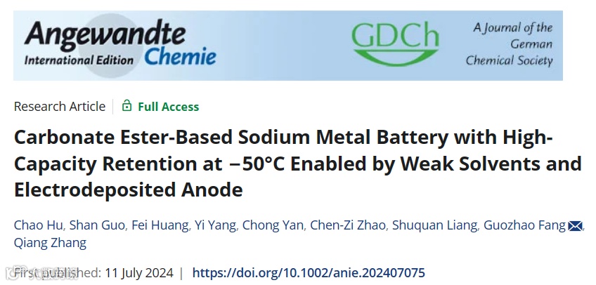 近日,清华大学张强教授与中南大学方国赵教授等人,在国际知名期刊Angew. Chem.上发表题为“Carbonate Ester-Based Sodium Metal Battery with High-Capacity Retention at −50°C Enabled by Weak Solvents and Electrodeposited Anode”的研究论文。通过碳酸酯类电解液的弱溶剂设计,使碳酸酯基电解液的冰点降至−80°C以下。同时,通过构筑了电沉积负极,减小了界面脱溶剂化能,并形成了富含NaF、Na3N等无机组分的固体-电解质界面膜。该文章从电解液设计和钠金属负极构筑两方面,显著提升碳酸酯类钠金属电池的稳定性,并实现在−50°C下的高容量保持率。
