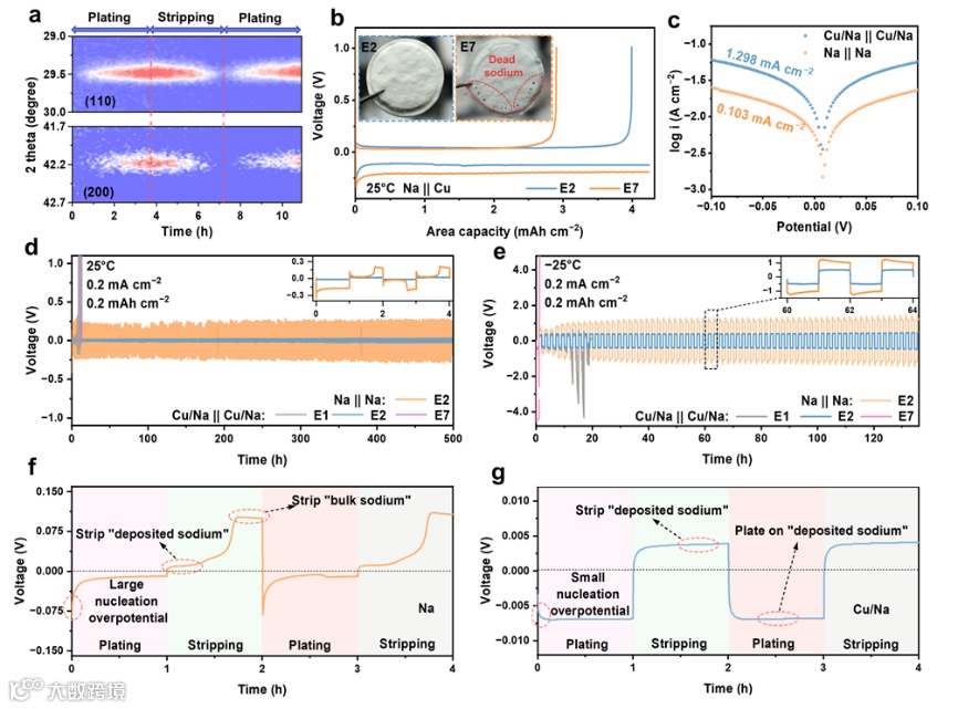 即使使用同一款电解液,电沉积的Cu/Na负极相较于常规的Na负极而言具有更快的动力学过程,Tafel测试可以证明这一点。对称电池说明在常温和低温下,Cu/Na负极都可以实现比Na负极小得多的极化。