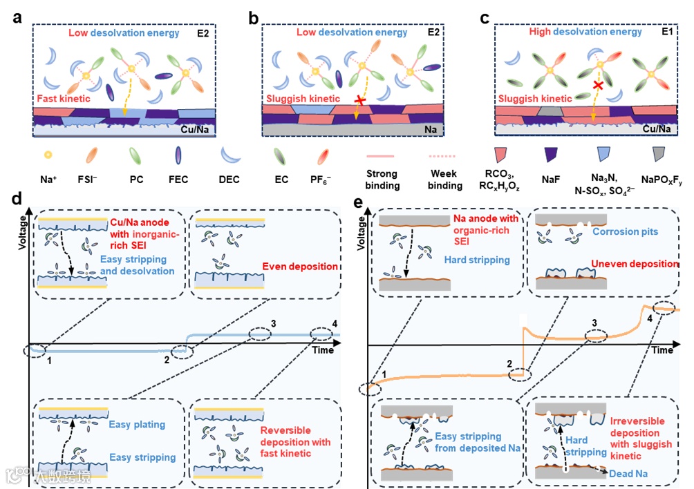 常规的钠金属负极动力学缓慢,极化曲线通常由两段组成,其中的高极化电压部分对应于钠离子穿过钠金属表面富有机组分的SEI膜,这导致电池的低温性能严重衰减。而通过简单的电沉积工艺,电解液中阴离子始终能参与SEI膜的形成,从而使电沉积钠形成富无机组分(NaF、Na3F等)的SEI膜。电沉积负极的极化曲线始终能保持低的极化电压,匹配低脱溶剂化能与宽温域的电解液,加速了钠金属电池在低温下的动力学过程。