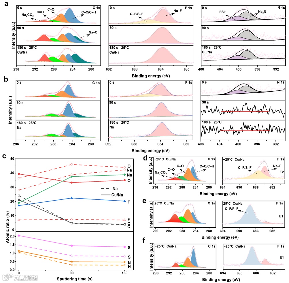 对不同负极表面的SEI膜进行了成分分析。Cu/Na负极具有更富无机的SEI膜,含有NaF和Na3N等成分。随着溅射的进行,Cu/Na的SEI膜中始终分布阴离子分解产物,而对于Na负极而言阴离子分解产物只在表面含有。Cu/Na负极与E2电解液所衍生的SEI膜受温度的影响较小。