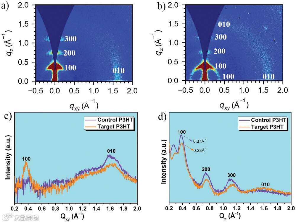 图3. a)控制P3HT薄膜和b)目标P3HT薄膜的2D-GIWAXS; 对应2D-GIWAXS图案的1D曲线 c) 在 IP 方向和 d) 在 OOP 方向。
