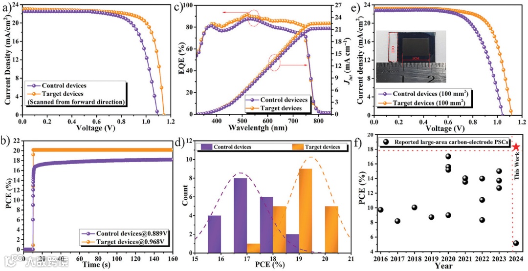 图5 a)正扫描冠军器件的J-V曲线;b) 冠军器件的SPO效率输出 c) 冠军器件EQE;d) 20个冠军装置的PCE直方图;e)面积为100mm2的冠军器件J-V曲线(插图为