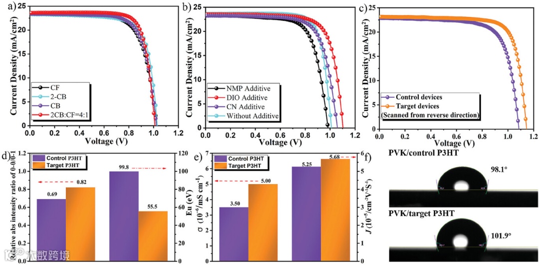 图2. (a–d) 基于P3HT HTL的器件的J-V曲线通过a)不同的溶剂和b)不同的添加剂;c) 基于甲醇后处理的P3HT HTL的控制装置和目标装置的J-V曲线(注意目标装置是在优化的溶剂和添加剂的基础上制造的);d)吸收0-0峰和0-1峰之间的相对吸收强度比值,Eu,e)电导率和空穴迁移率,f)控制P3HT薄膜和目标P3HT薄膜的水接触角。