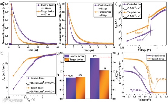 图6 a) TPC谱图,b) Jph与Veff谱图,c) TPV谱图,d)优化器件载流子复合度直方图;e)纯空穴器件SCLC曲线;f)Mott-Schottky曲线。