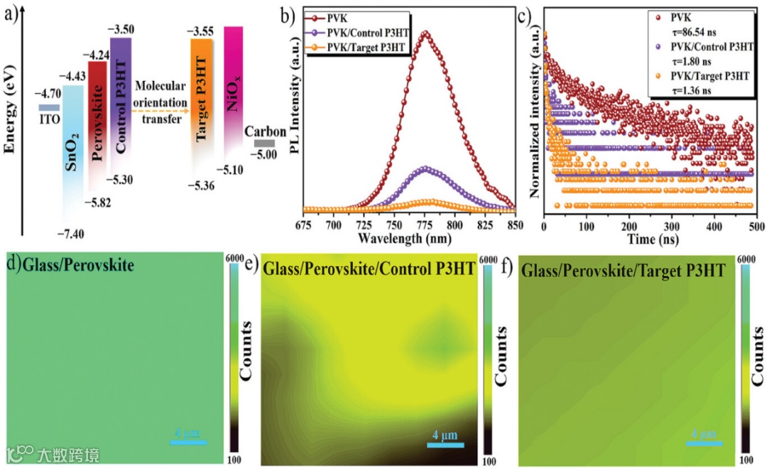图4. (a) 器件各功能层能级图;b)原始钙钛矿膜(PVK)、PVK/对照P3HT膜和PVK/目标P3HT膜在入射光指向P3HT层时的PL光谱和c) TRPL光谱;d)原始钙钛矿膜(PVK)、e) PVK/对照P3HT膜和f) PVK/靶P3HT膜入射光对P3HT层的PL映射图。