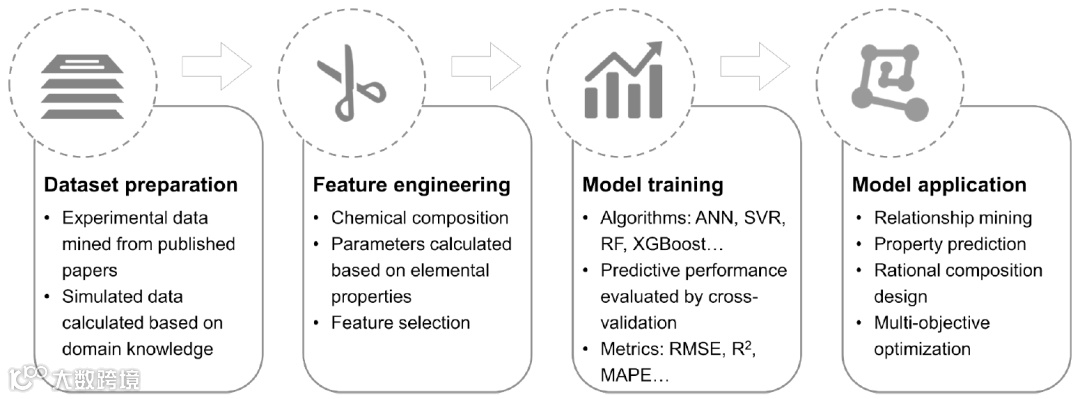该综述论文全面总结了近年来磁性复合复杂合金的机器学习研究进展;包括通过特征选择、超参数调优、机器学习算法筛选,训练出具备优秀预测能力的机器学习模型,并基于训练机器学习模型实现对多元合金宏观性能的准确预测,数据驱动的多阶段优化设计方法,实现多元铁基合金单个目标性能的快速优化设计 以及数据驱动的多目标优化方法(如兼具高铁磁强度和机械强度的Fe-Co-Ni-Al-Si系多元铁基高熵合金)等主要进展成就,最后对该领域的未来发展方向进行总结展望,并提出了未来应用方向。该综述论文工作对机器学习在其他材料领域以及分子药物等领域的应用都有借鉴价值。