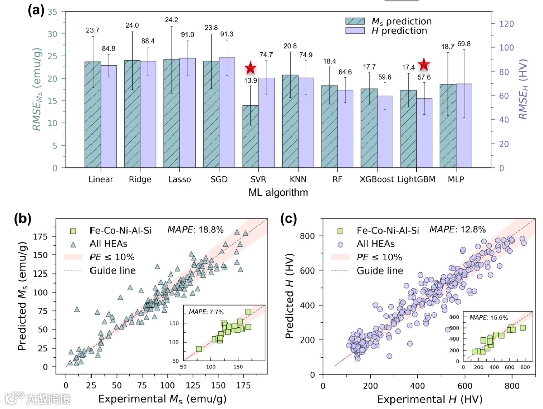 图5.磁性CCA材料的Ms性能和硬度性能的ML预测模型的CV分数。(a)基于10个ML算法的模型的RMSE评分。(b) Ms和(c)硬度的预测值与相应的实验值的对比比较。PE:错误百分比。
