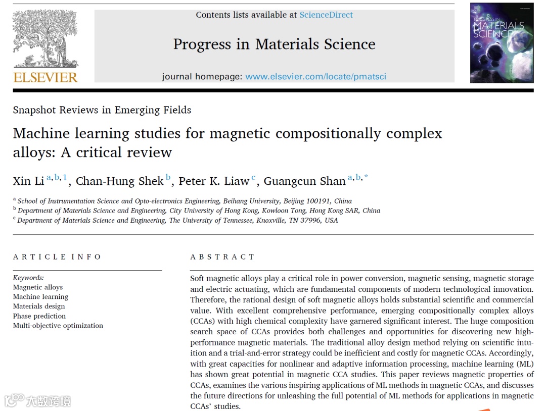 2024年7月,北京航空航天大学单光存教授和香港城市大学石灿鸿教授团队在国际材料科学领域权威综述期刊《材料科学进展》(Progress in Materials Science)在线发表了题为《磁性复合复杂合金的机器学习研究:关键综述》(Machine learning studies for magnetic compositionally complex alloys: A critical review)的长篇综述论文。