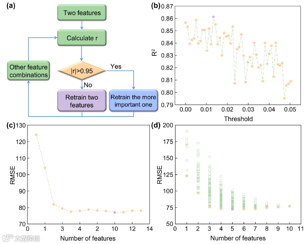 图4. 一种在复杂磁性合金的机器学习研究中的四步特征选择方法。(a)相关性筛选。基于射频的(b)特征选择。(c)正向选择。(d)最佳子集选择.
