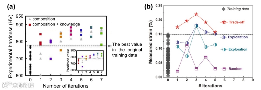 Fig. 7. Experimental results of the iterative loop. (a) Alloying compositions with desired properties better than anyone in the training dataset were found after 2nd iteration of experiments. (b) The optimization ability of the utility function based on the trade-off between exploration and exploitation outperformed others.