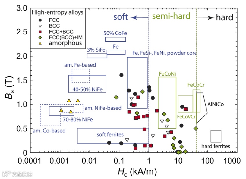 图2 各种磁性合金的Bs-Hc Ashby图。