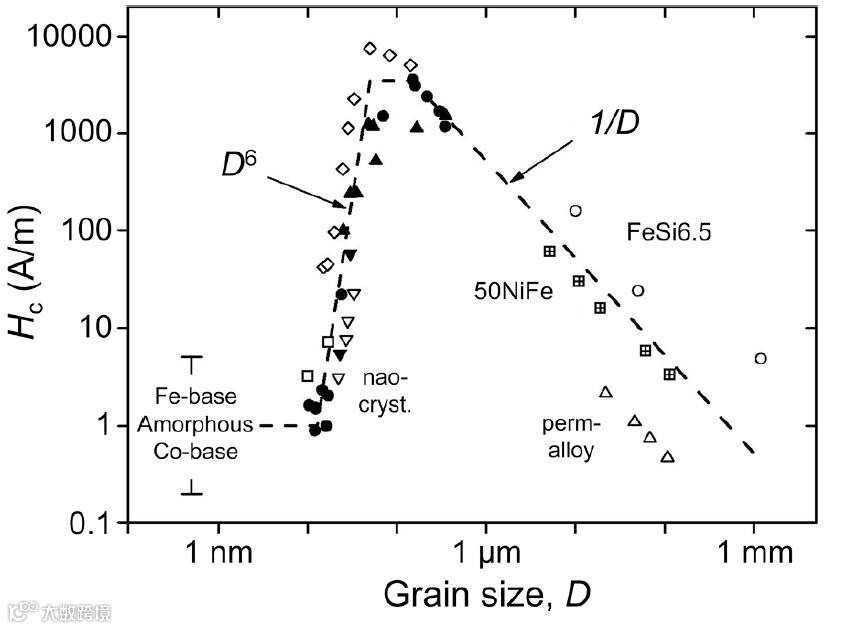 图1. 各种软磁性金属合金的磁矫顽力Hc与晶粒度尺寸D。