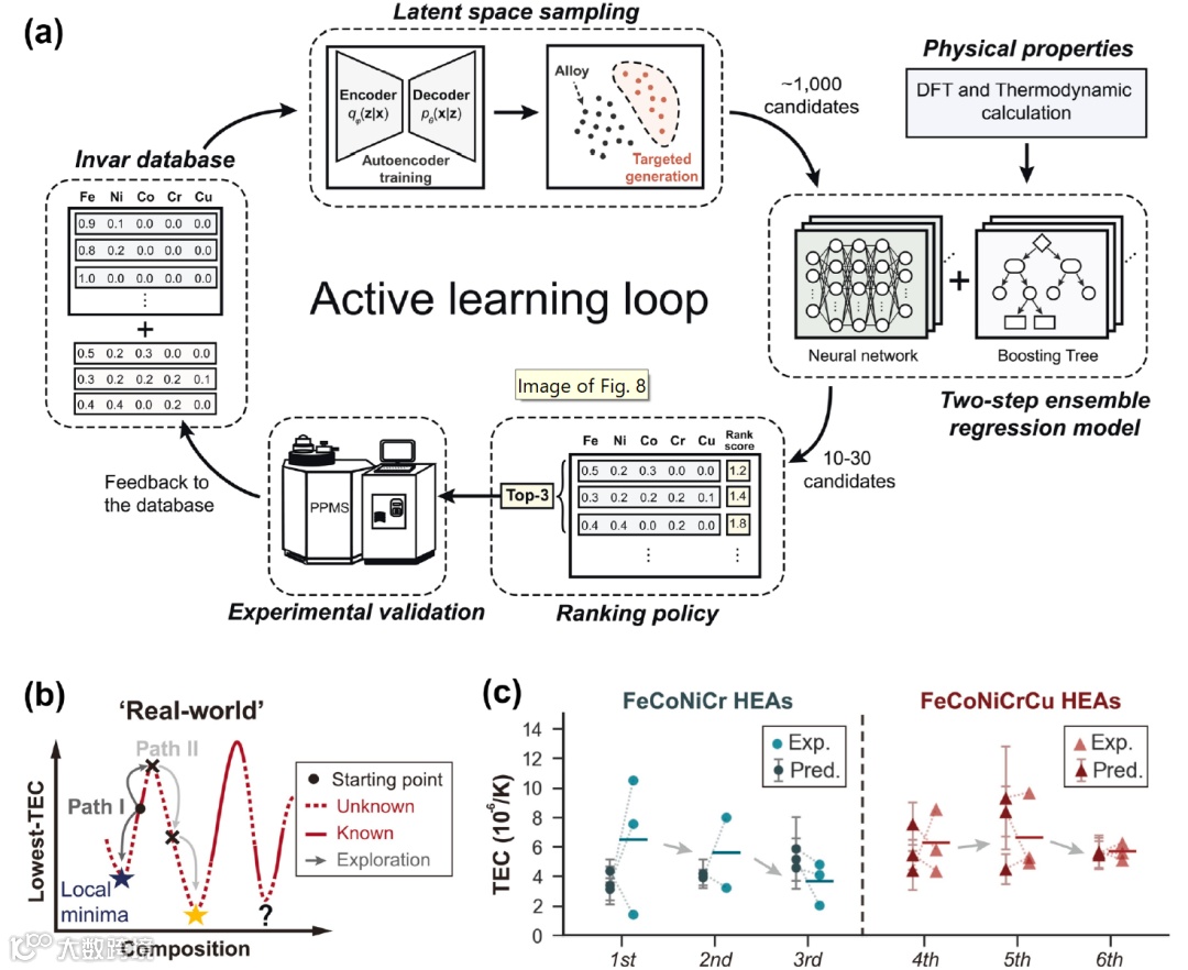 图6. 面向CCA合金性能优化的主动学习框架内进行迭代实验设计循环流程图