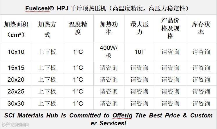 Fueiceel® HPJ千斤顶热压机(高温度精度,高压力稳定性)是由科学材料站设计开发的一款专门用于稳定热压的机器,如膜电极和膜电极组件的制作。Fueiceel® HPJ热压机是一种利用热能和压力将材料结合或成型的设备。它通过对材料施加高温和高压,使其内部分子运动加剧,促使材料之间的紧密结合,形成所需的结构或组件。热压机广泛应用于电子、复合材料、塑料和能源等领域。