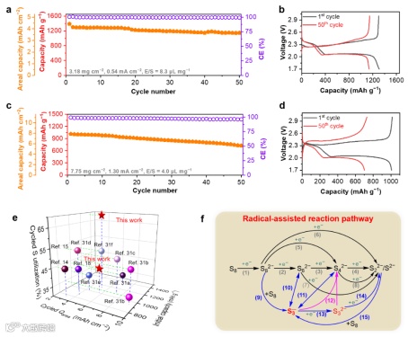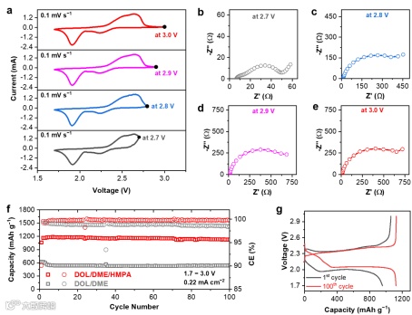 图7. 基于六甲基磷酰三胺的高溶型电解液组装Li–S电池的电化学性能