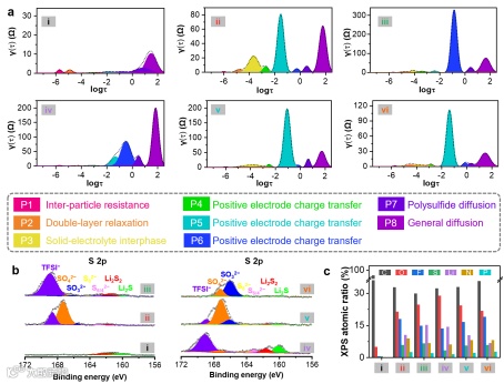 为了建立Li2S电化学沉积与CEI界面化学的动态关联,本研究利用SEM、EIS、DRT以及XPS等表征,研究不同SoCs条件下循环的硫正极表面Li2S沉积形貌、电化学阻抗、界面电化学与化学组分之间的关联,结果表明基于六甲基磷酰三胺的高溶型电解液工程策略,不仅显著促进LiPSs的高效转化,还可以形成含S-/P-的化学组分显著提高CEI界面化学稳定性。