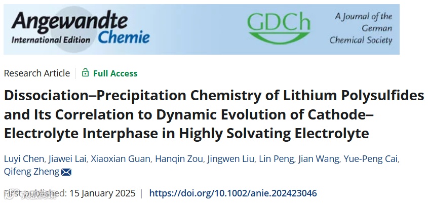 近日,华南师范大学郑奇峰团队在Wiley出版社期刊Angew. Chem. Int. Ed.上发表了题为“Dissociation–Precipitation Chemistry of Lithium Polysulfides and Its Correlation to Dynamic Evolution of Cathode–Electrolyte Interphase in Highly Solvating Electrolyte”的研究成果。该工作提出了一种基于六甲基磷酰三胺(HMPA)的高溶型电解液策略,阐明了多硫化锂(LiPSs)的解离-沉积化学及其与正极电解质界面膜(CEI)动态演化的相关性,从而有效调节多硫化锂的溶解度并形成自由基辅助转换化学路径,实现Li2S的三维(3D)电化学沉积并提高硫利用率,以及形成的 CEI 提高电池循环稳定性。该工作为设计高能量密度锂硫电池用高溶型电解液提供新的认识。