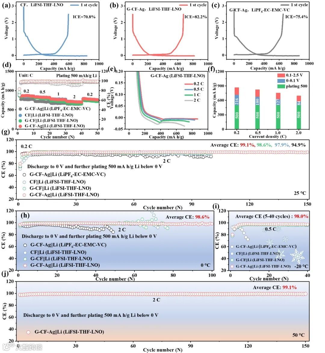 Figure 3. G-CF-Ag在50°C到-20°C宽温范围下混合半电池性能.