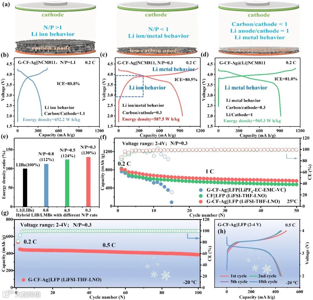 N/P比为0.3时,混合全电池G-CF-Ag||NCM811在0.2 C下提供587.5 W h kg−1的高能量密度。在相同的N/P比条件下,G-CF-Ag||LFP在50°C至-20°C的宽温度范围内能够稳定循环。